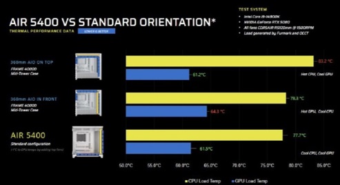 ‘에어 5400 케이스’는 CPU 전용 냉각 챔버를 전면부에 배치하여 외부의 차가운 공기를 라디에이터로 유입시키고, 발생한 열기를 별도의 통로로 즉시 배출하는 구조로 설계되었다. 이로써 CPU와 GPU의 냉각 공정을 완전히 분리해 AIO 쿨러를 상단에 장착했던 기존의 방식에 비해 월등히 향상된 냉각 효율을 제공한다.