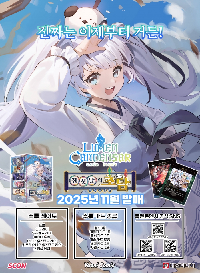 야오니코믹 개발, 대원미디어 유통의 오프라인 TCG '루멘콘덴서'가 버추얼 유튜버 MCN '미츄' 소속 인기 크리에이터 '이오몽'과의 협업으로 오는 11월 25일 콜라보 확장 부스터팩 2탄 "잔칫날의 초담"을 출시한다. 지난 콜라보 1탄에 이어 진행되는 확장 부스터팩은 "카드게임으로서는 대한민국 최초의 버튜버 크리에이터 협업" 사례로 주목받으며, 기존 유저와 신규 팬층 모두에게 특별한 경험을 선사할 전망이다.