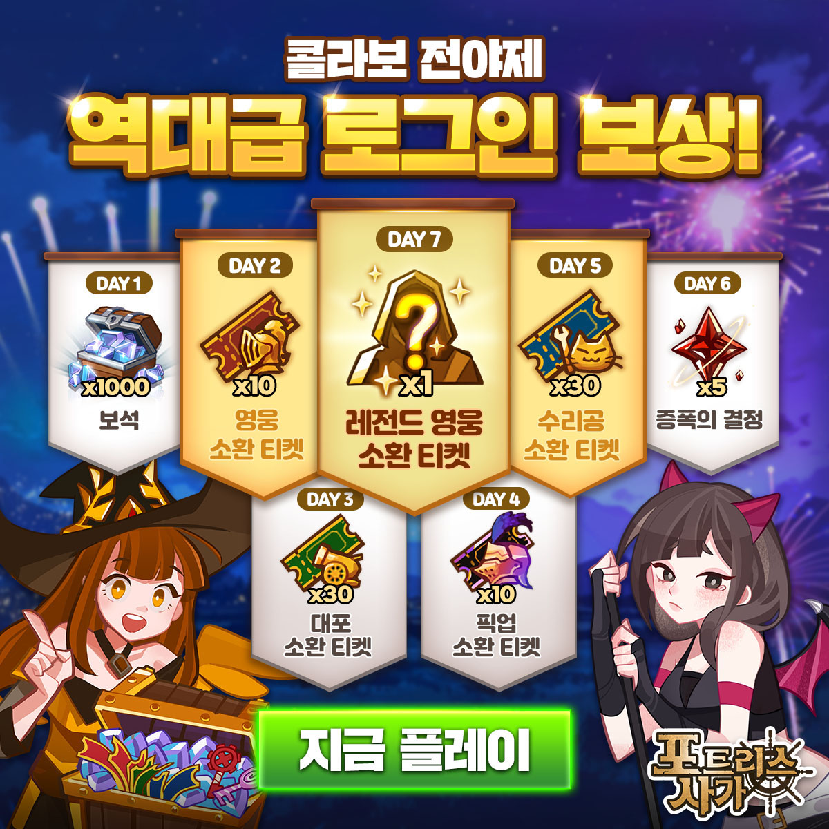 출석 보상은 1일차 보석 1,000개를 시작으로 영웅 소환 티켓, 대포 소환 티켓, 픽업 소환 티켓, 수리공 소환 티켓, 증폭의 결정 등이 단계적으로 지급된다. 7일 출석을 달성하면 레전드 영웅 소환 티켓 1장을 추가로 획득할 수 있어, 신규 유저도 부담 없이 참여할 수 있다.