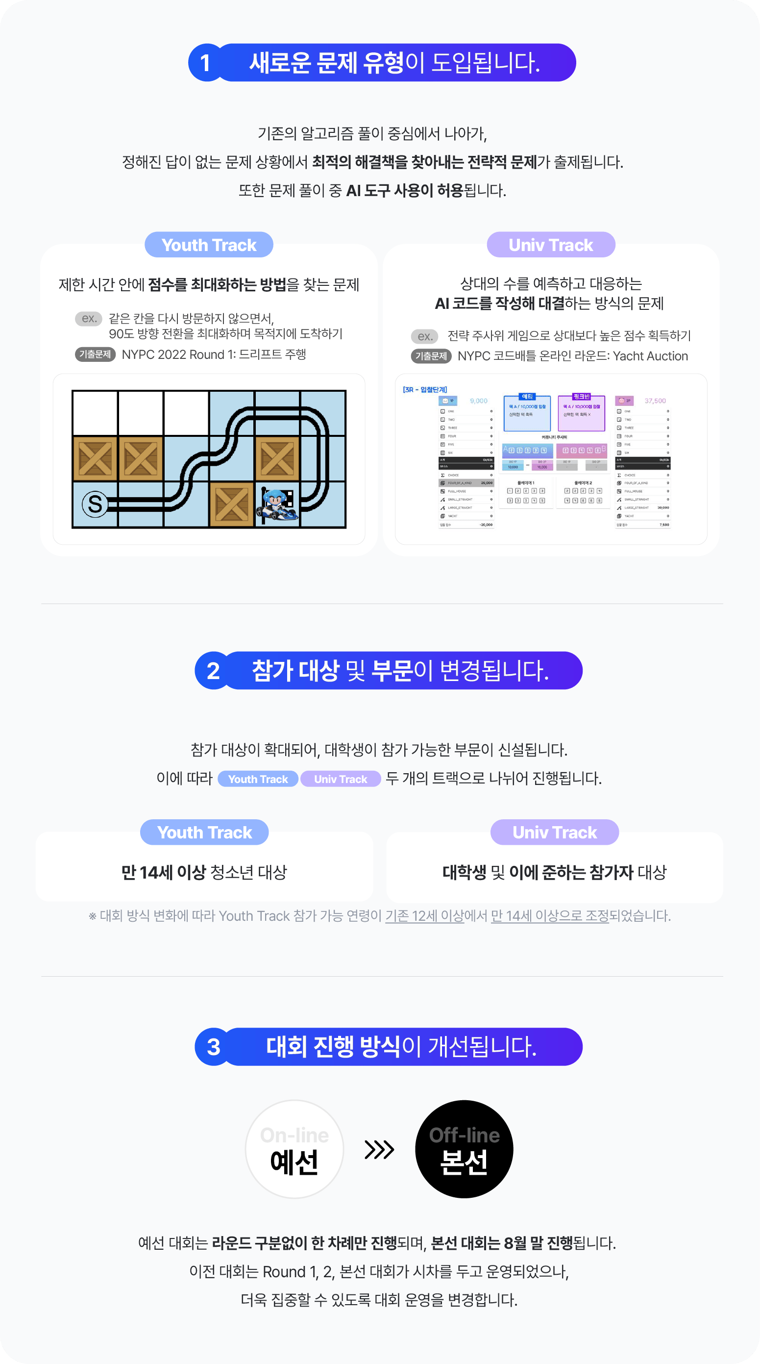 또한 새로워진 문제의 특성과 난이도를 고려해 참가 연령대를 상향 조정하고 ‘청소년’과 ‘대학생’ 부문으로 이원화한다. 청소년 부문(만 14세~19세)은 기존의 연령별 트랙 구분(만 12~13세, 만 15~19세)을 없애고 단일 트랙으로 통합한다. 대학생 부문(만 20세 이상)은 지난해 대회 10주년 기념 이벤트로 진행해 호응을 얻었던 ‘NYPC 코드배틀’을 정식 트랙으로 편성해 신설한다.