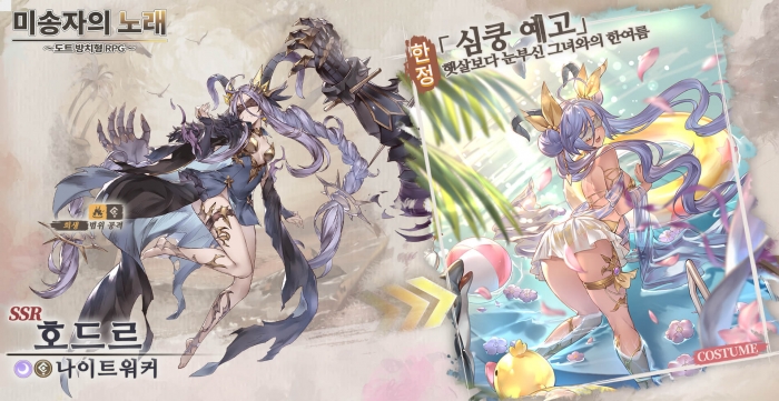 코스튬 「심쿵 예고」에서 밤을 홀로 걷는 ‘어둠의 신’ 「호드르」는 정적의 속박을 과감히 깨뜨리고 가벼운 화이트 수영복으로 갈아입었습니다. 그녀의 상징인 안대를 여전히 착용하고 있지만, 반짝이는 해변을 배경으로 신비로우면서도 귀여운 매력을 발산합니다.
