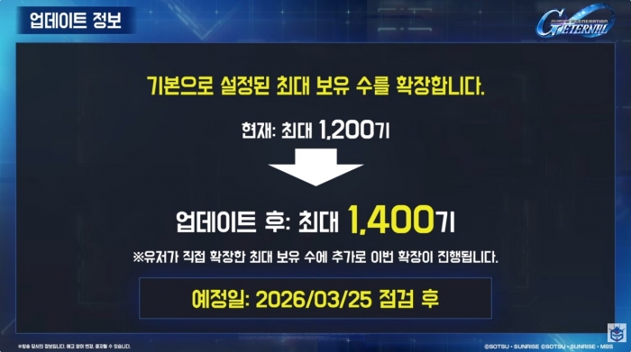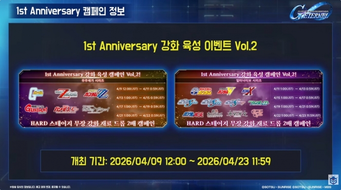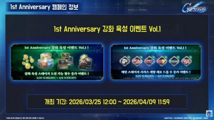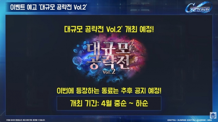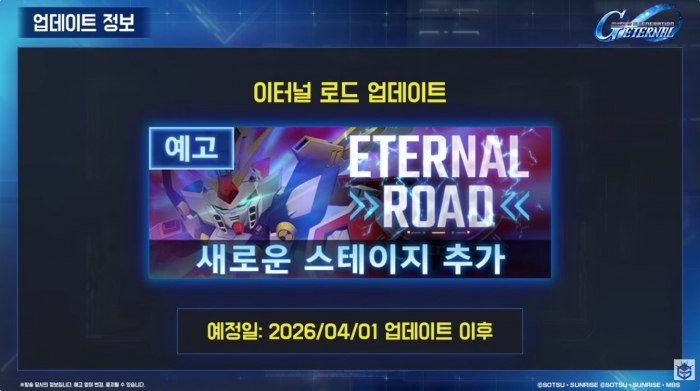 3월 25일부터 4월 1일까지는 ‘건담파이트 마스터리그 시즌10’이 열리며 경쟁 콘텐츠가 먼저 시작된다. 이어 4월 1일부터 16일까지는 강력한 적을 상대하는 ‘강적 습격 스콜피오’ 이벤트가 진행되고, 4월 중순부터 하순 사이에는 ‘대규모 공략전 Vol.2’도 개최된다. 이 외에도 이터널 로드와 히스토리 스테이지(블루 데스티니), 태그 스테이지 등 핵심 콘텐츠들이 순차적으로 확장될 예정이다.