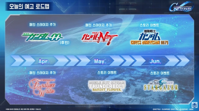 이후에도 스케줄은 빈틈 없이 이어진다. 5월 중순에는 ‘건담 선더볼트 BANDIT FLOWER’를 기반으로 한 스토리 이벤트가 시작되고, 5월 말에서 6월 초 사이에는 ‘기동전사 건담 CROSS DIMENSION 0079’가 콘텐츠로 추가된다. 이어 6월 중순부터 하순까지는 ‘기동전사 건담 SEED C.E.73 STARGAZER’가 업데이트될 예정이다.