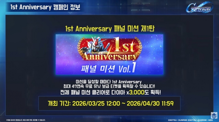 4월 한 달 동안 진행되는 패널 미션을 모두 완료하면 SSR 건담 엑시아[TRANS-AM] 풀돌이 무료로 지급된다. 또한 최대 47연속 무료 보급이 열리며, 이를 통해 UR 유닛을 최소 2기 이상 얻을 수 있다.