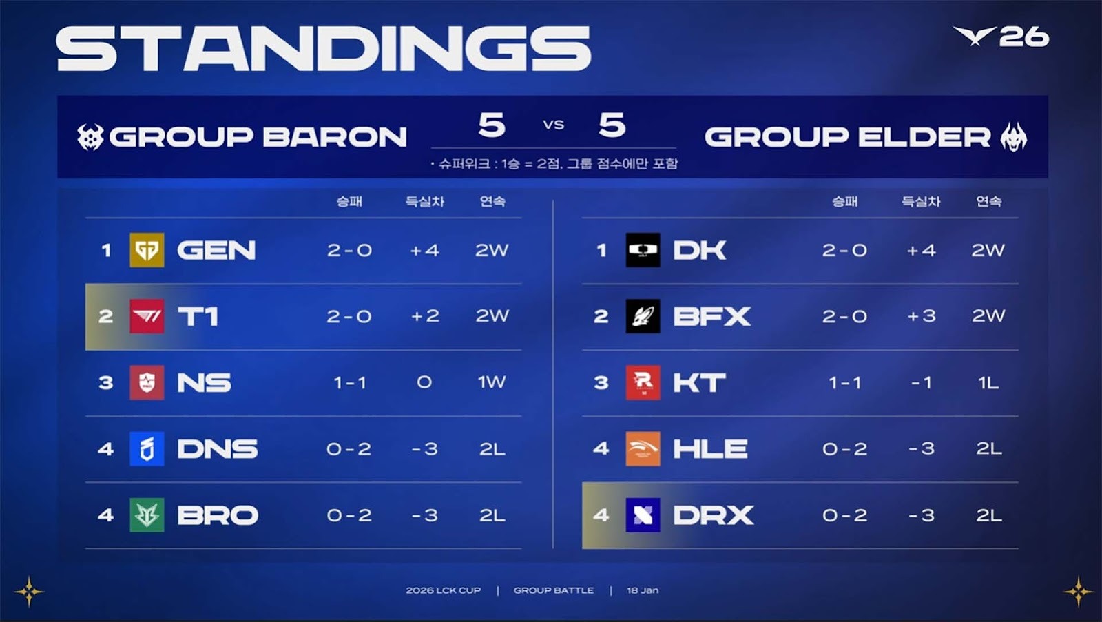 장로 그룹에서도 비슷한 양상이 펼쳐졌지만 지명 순서가 다소 늦었던 팀들이 빛나는 활약을 펼쳤다. 2025 LCK컵 그룹 대항전을 지배했던 디플러스 기아가 이번에도 좋은 모습을 보이면서 2전 전승을 기록했고 2025년 1승도 거두지 못했던 BNK 피어엑스가 확 달라진 경기력으로 2연승을 내달렸다. KT 롤스터는 1승 1패로 중위권을 기록 중이며 한화생명e스포츠와 DRX는 2패로 첫 주 일정을 마감했다.