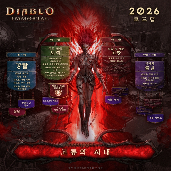 2026년 로드맵 : 전설적인 고뇌의 여제 안다리엘(Maiden of Anguish Andariel)이 깨어나고, 새로운 악마술사 직업과 함께 신규 지역과 이벤트, IP 콜라보레이션, 다양한 게임플레이 업데이트가 포함된 신규 콘텐츠가 2026년 내내 찾아올 예정이다.