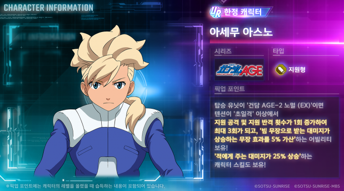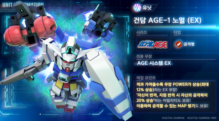 강력한 신규 유닛을 획득할 수 있는 픽업 뽑기도 개최된다. 이번 뽑기에는 UR 「건담 AGE-2 노멀(EX)」 / UR 「아세무 아스노」가 기간 한정 유닛으로 등장하며, UR 「건담 AGE-1 노멀(EX)」 / UR 「플리트 아스노」와 UR 서포터 「그로덱 아이노아 & 디바」가 새롭게 라인업에 포함되었다. 해당 뽑기는 3월 25일까지 진행될 예정이다.