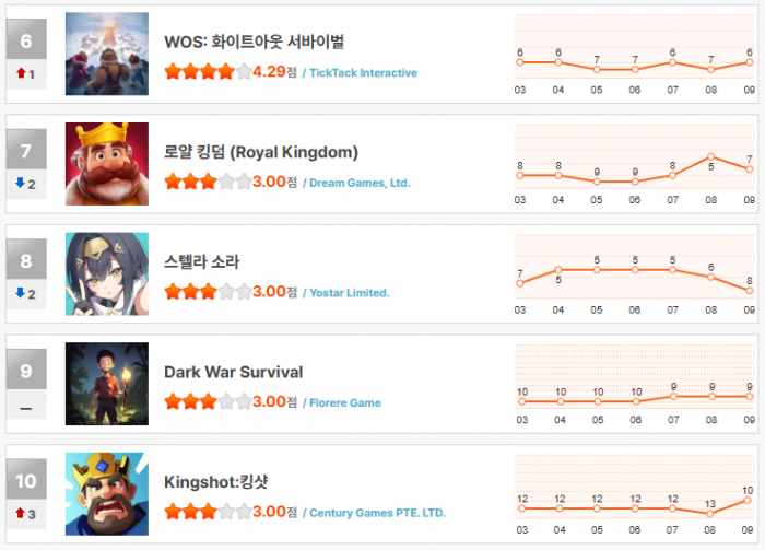 하위권에서는 ‘다크워 서바이벌’(9위)이 버티는 가운데, ‘킹샷’이 오랜만에 TOP10에 복귀했다.