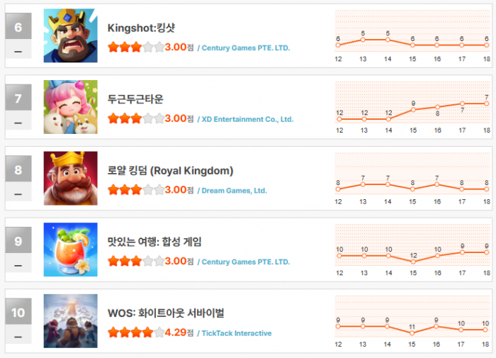 ‘맛있는 여행: 합성 게임’은 10위에서 9위로 한 계단 상승한 반면, 한때 차트 상위권을 장악했던 ‘WOS: 화이트아웃 서바이벌’은 10위로 밀려나며 다소 주춤한 모습이다.