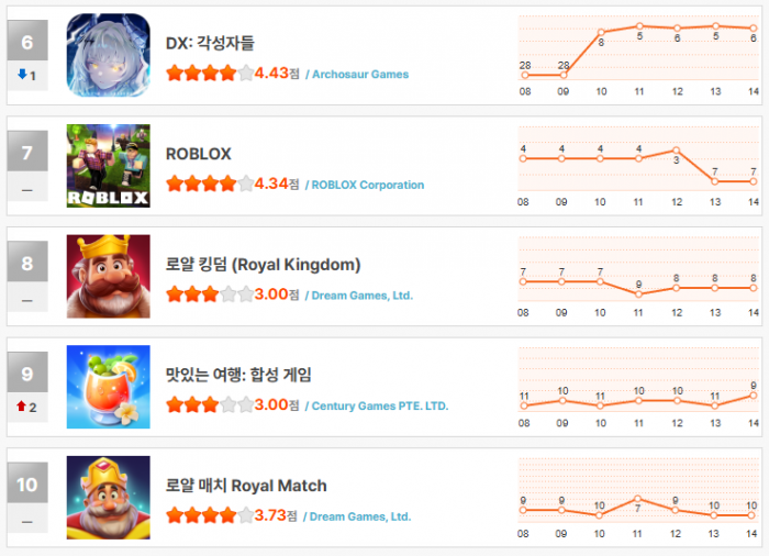 이 밖에도 ‘로블록스’는 7위로 하락했고, ‘로얄 킹덤’은 8위를 유지했다. ‘맛있는 여행: 합성 게임’은 두 계단 상승해 9위에 올랐고, ‘로얄 매치’는 10위를 기록했다.