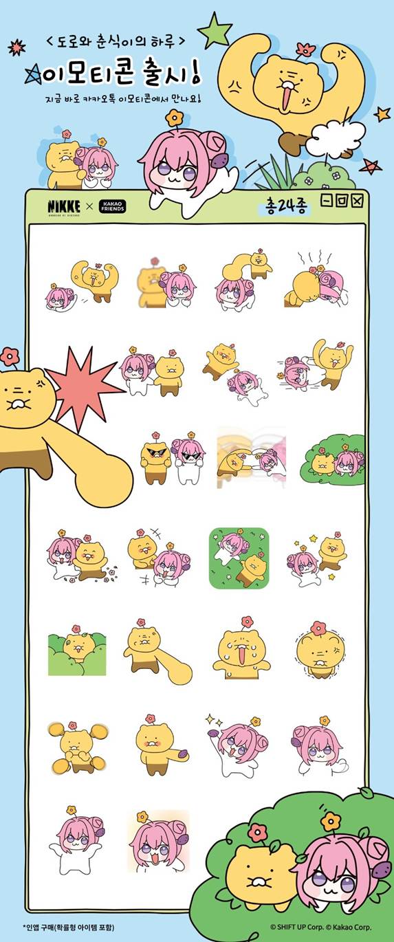 이번 협업에서는 ‘승리의 여신: 니케’의 메인 캐릭터 ‘도로시’에서 파생되어 전 세계에서 선풍적인 인기를 얻고 있는 2차 창작 캐릭터 ‘도로’와 카카오프렌즈의 인기 캐릭터 ‘춘식이’가 만나 두 캐릭터의 엉뚱하고 예측불가한 매력이 돋보이는 제품들을 선보인다.