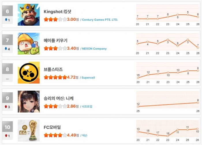 중위권에서는 다소 큰 변동이 감지된다. ‘킹샷’은 6위로 한 계단 하락했고, 한때 최상위권을 지키던 ‘메이플 키우기’는 무려 7위까지 밀려나며 하락세가 뚜렷해졌다. 최근 신작 공세와 경쟁 심화 속에서 확실한 반등 계기를 만들지 못하고 있는 모습이다.