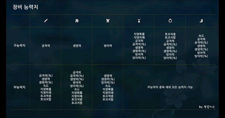 장비 주옵 부옵 정리표