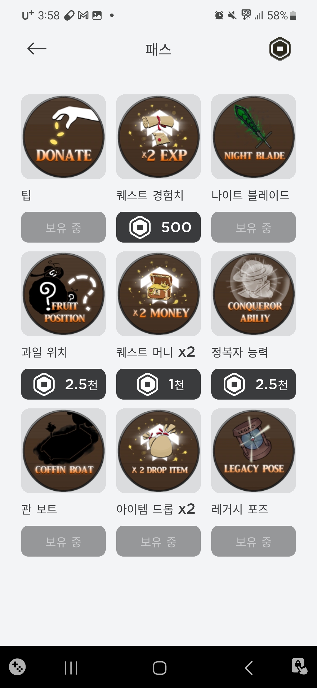 패왕색 (패스 사진엔 없는것 처럼 뜨지만 게임 내에서 선물 받아서 그렇게 뜨는겁니다.) , 요루 , 미배 등 대부분 게임패스 보유중