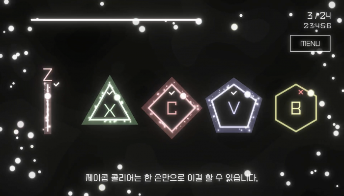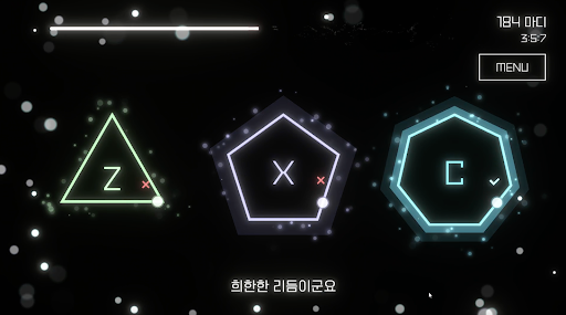 동그라미가 도형의 꼭짓점과 만나는 순간에 맞는 키를 누르기만 하면 되는 간단한 게임!