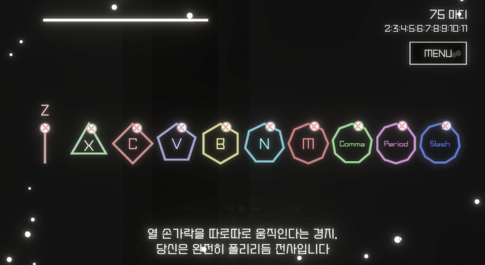 ‘폴리리리리듬’은 복잡한 박자 구조를 기반으로 한 신개념 리듬 게임으로, 3박자, 5박자, 7박자 등 다양한 박자가 동시에 진행되는 혼합 리듬을 다룬다. 초보자용 모드부터 엇박 모드, 연습 모드, 그리고 고난이도의 ‘제이콥 콜리어 챌린지+’까지 다채로운 모드를 제공하며, 리듬게이머뿐 아니라 드러머 및 리듬 훈련을 원하는 이용자에게도 적합한 콘텐츠를 갖추고 있다.