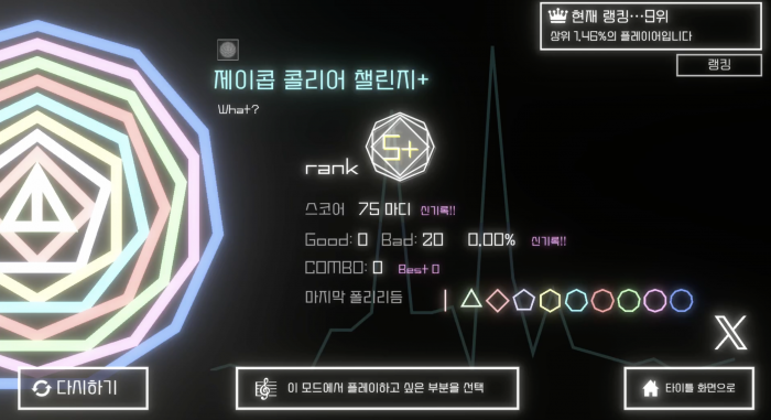 개발자 나마리카르테는 “본인조차 제대로 클리어하지 못할 정도로 어렵게 만들었는데, 오히려 많은 리듬 고수들이 몰려와 놀랐다”며 “정식 버전에서는 더욱 확장된 볼륨과 완성도를 갖추고 돌아오겠다”고 밝혔다.