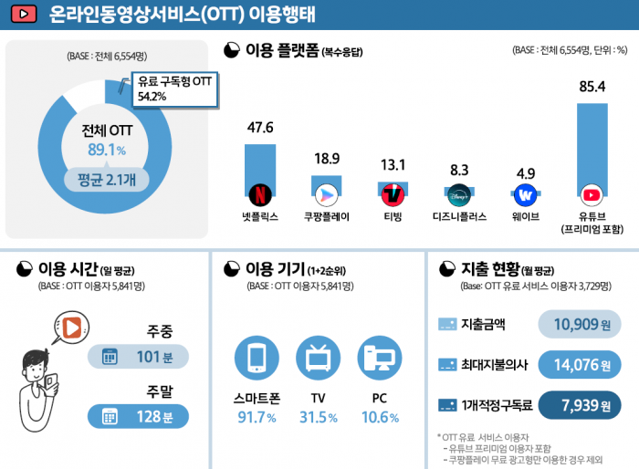 전체 온라인 동영상 서비스(OTT) 이용률은 89.1%로, 국민 10명 중 9명이 온라인 동영상 서비스(OTT)를 이용하며 평균 2.1개를 구독하는 것으로 나타났다. 유료 구독형 온라인 동영상 서비스(OTT) 이용률은 54.2%로 조사돼, 온라인 동영상 서비스(OTT) 시청이 국민의 일반적인 콘텐츠 이용 행태로 자리 잡았음을 확인했다.