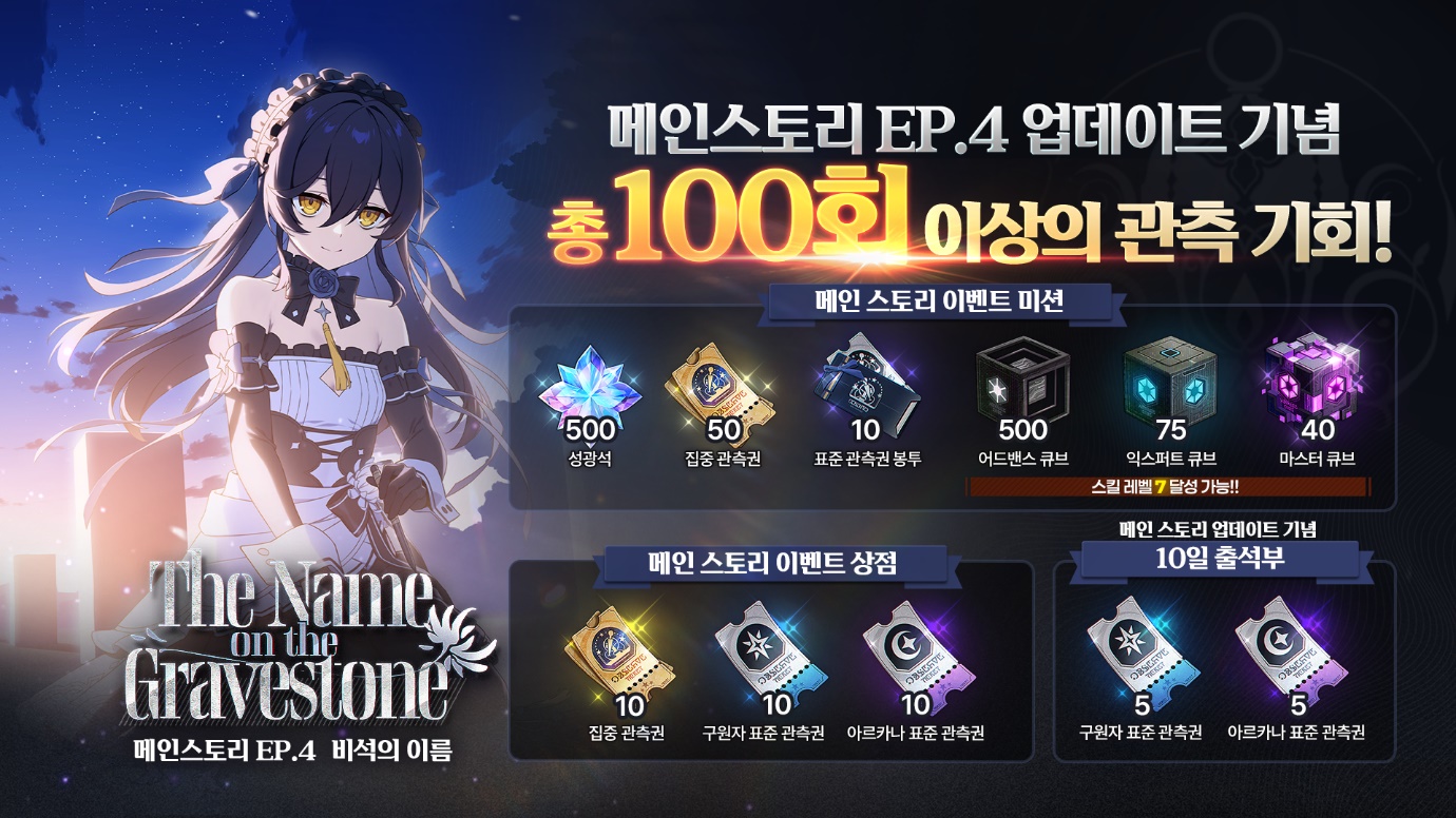 또한, 메인스토리 이벤트 상점과 업데이트 기념 출석부 이벤트를 통해 '집중 관측권'과 '표준 관측권' 등 유저들이 선호하는 핵심 아이템을 대거 지급할 예정이다.