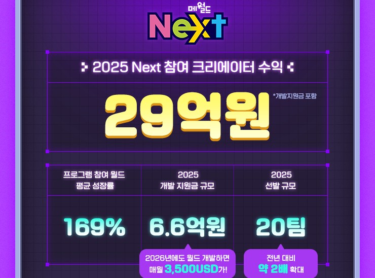 이러한 성장의 배경에는 크리에이터 지원 프로그램 ‘메월드 Next’가 있다. 넥슨은 2025년 넥스트 프로그램의 지원 대상을 2024년 대비 두 배인 20팀으로 확대했으며, 선정된 팀들은 한 해 동안 총 29억 원의 수익을 기록했다.