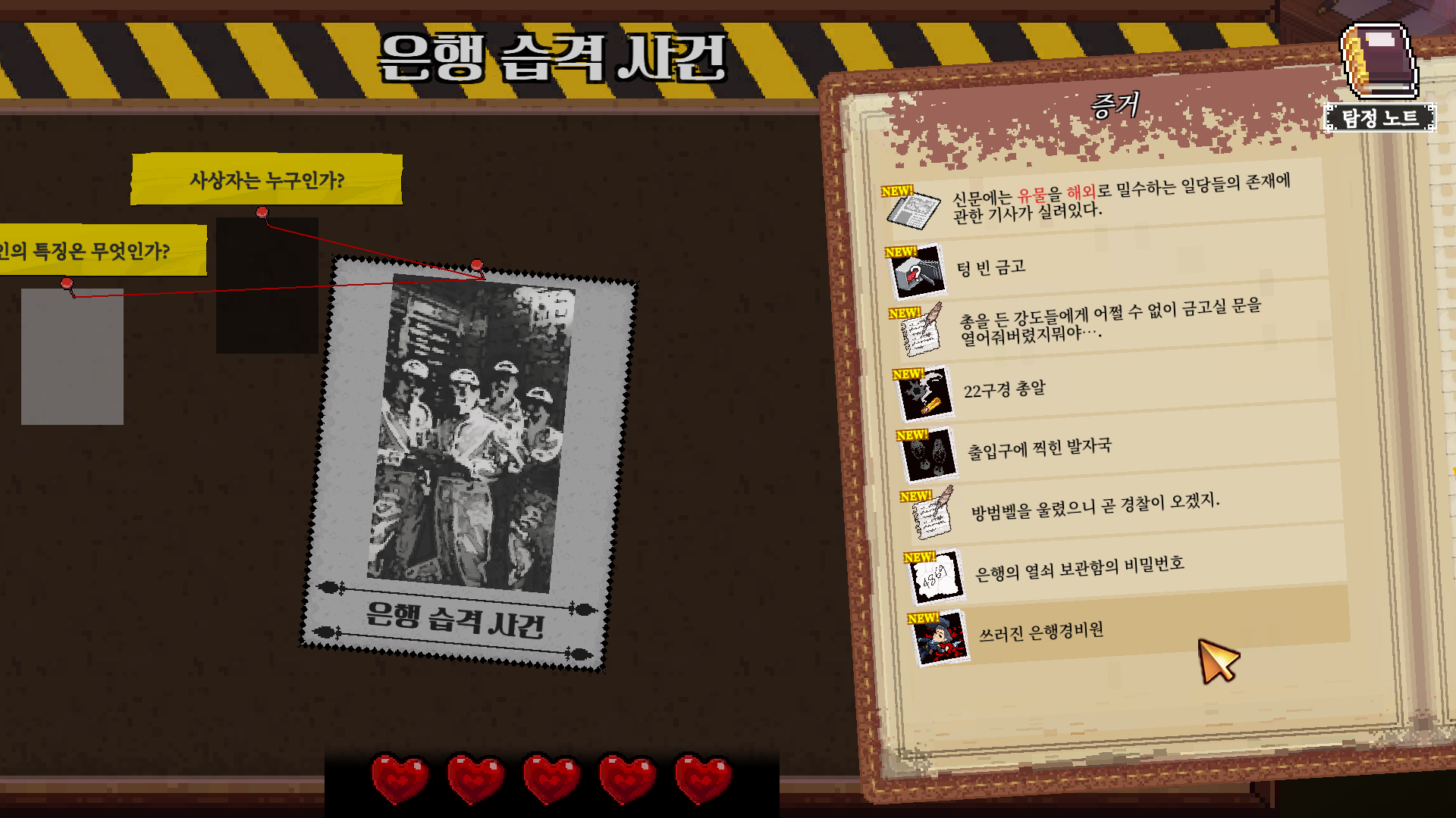 또한, 현재 내가 어떤 아이템과 어떤 증거를 수집했는지도 노트에 기록하고 살필 수 있다.