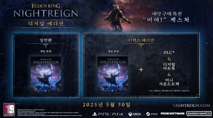 반다이남코 엔터테인먼트 코리아는 PlayStation®5, PlayStation®4, Xbox Series X|S, Xbox One, Steam®용 스탠드 얼론 어드벤처 협력 액션 서바이벌 ‘ELDEN RING 밤의 통치자’를 2025년 5월 30일(금) 발매한다고 발표했다.