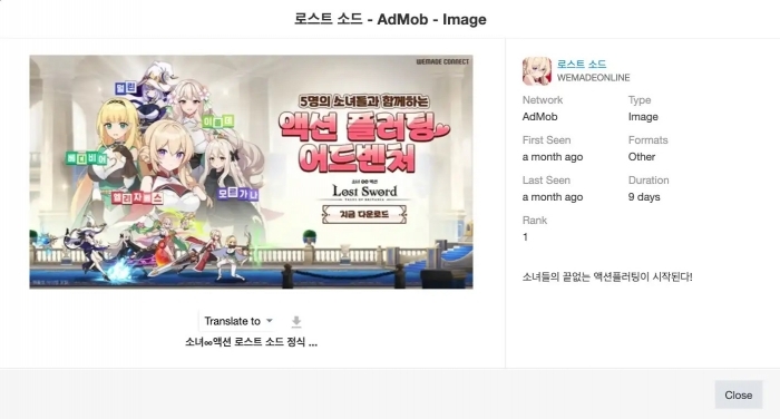 한편, 센서타워의 광고 데이터에 따르면, 《로스트 소드》는 전체 광고 노출 중 약 79%를 AdMob을 통해 확보하며 1월 기준 모바일 서브컬처 게임 광고 점유율 2위, 2월에는 1위를 기록한 것으로 나타났다. 센서타워는 《로스트 소드》의 광고 소재가 이미지 기반의 2D 비주얼 스타일을 강조하면서도, ‘액션 플러팅 어드벤처’라는 광고 카피를 활용해 방치형 게임 속에서도 액션과 서브컬처적 요소를 강조한 점이 효과적이었다고 평가했다.