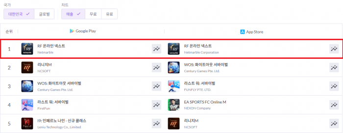 ‘RF 온라인 넥스트’는 지난 20일 출시 이후 18시간 만에 애플 앱스토어 매출 1위를 달성한 것은 물론, 6일 만에 구글 플레이스토어 매출 1위를 기록, 양대마켓을 석권하며 초반 흥행에 성공했다.
