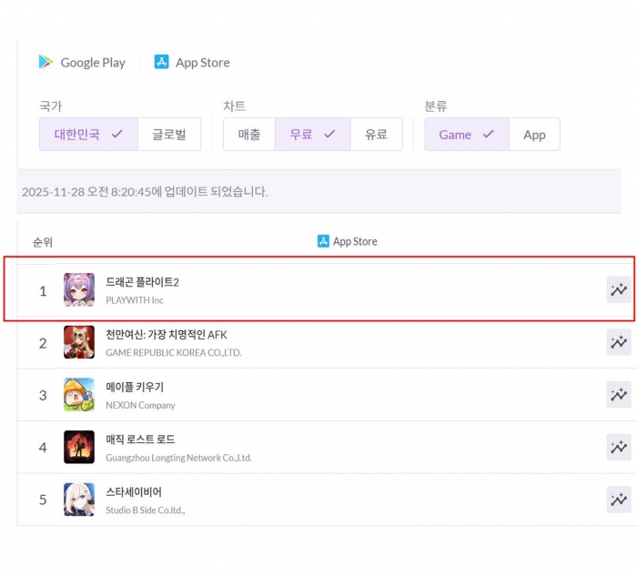 ‘드래곤 플라이트2’는 출시 당일 오후, 서비스 시작 약 6시간 만에 애플 앱스토어 무료 게임 인기 순위 1위에 이름을 올렸으며 현재까지 그 순위를 유지하고 있다.
