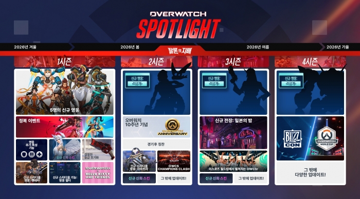 오버워치는 2026년 한 해 동안, 2월 11일 한꺼번에 등장할 5명의 신규 영웅을 포함해 총 10명의 신규 영웅을 선보인다. 오는 11일 탈론 진영의 도미나(Domina), 엠레(Emre) 및 미즈키(Mizuki)와 오버워치 진영의 신성 안란(Anran, 2월 6일~11일 무료 영웅 체험 예정), 제트팩 캣(Jetpack Cat) 등 큰 기대를 받는 5명의 신규 영웅들이 오버워치에 등장하며, 2시즌부터 6시즌까지 매 시즌마다 추가로 1명의 영웅을 선보이며 계속해서 진행되는 서사를 이끌어가는 동시에, 혁신적인 기술과 매력적인 게임플레이로 전투를 흔들어 놓을 것이다.