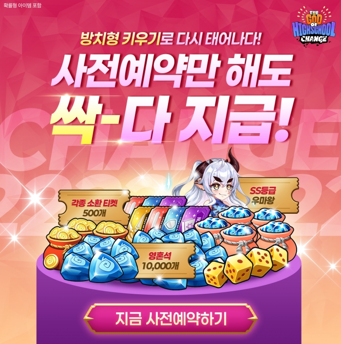 한편, ‘갓 오브 하이스쿨 체인지’는 구글플레이 스토어, 애플 앱스토어, 원스토어로 출시될 예정이며, 사전예약은 2월 25일부터 진행되며 모든 사전예약을 완료할 경우 SS 등급 캐릭터 랜덤 소환권, S 캐릭터 랜덤 선택권, 영혼석, 각종 소환 티켓 등 총 50만원 상당의 상품을 지급할 예정이다.