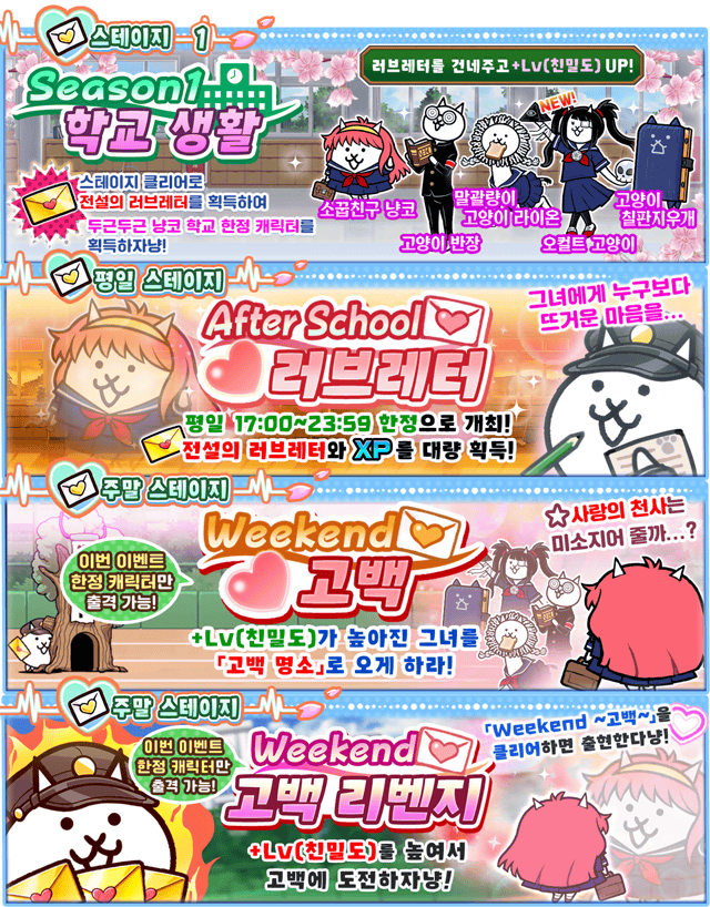 신규 기간 한정 스테이지도 함께 추가된다. ‘Season1 ~학교 생활~’과 평일 오후 5시부터 자정 전까지 도전 가능한 ‘After School ~러브레터~’가 등장하며, 해당 스테이지를 클리어하면 이벤트 전용 뽑기에 사용되는 ‘전설의 러브레터’를 획득할 수 있다. 이를 통해 소꿉친구 냥코, 말괄량이 고양이 라이온, 고양이 칠판지우개, 고양이 반장 등 한정 EX 캐릭터와 신규 캐릭터 ‘오컬트 고양이’를 얻을 수 있다.