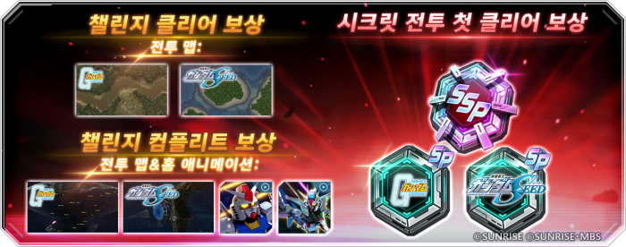 고난도 콘텐츠인 ‘메인 스테이지 CHALLENGE’도 신규 도입되었다. 이 모드는 강화된 적들이 등장하며 편성 부대가 특정 시리즈로 제한되는 등 전략적인 플레이가 요구된다. 현재 ‘기동전사 건담’과 ‘기동전사 건담 SEED’ 작품이 공개되었으며, 클리어 시 유닛, 캐릭터, 다이아는 물론 홈 화면을 꾸밀 수 있는 전용 애니메이션과 배틀 맵 등 특별 보상을 획득할 수 있다.