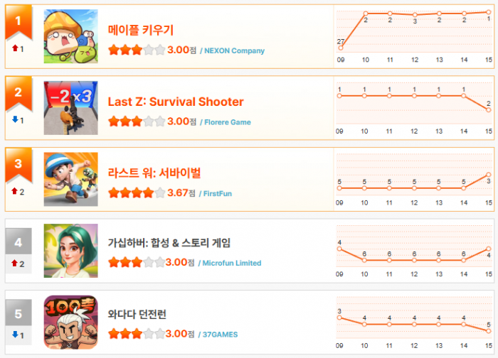 11월 2주차 랭킹은 그야말로 ‘메이플스토리 IP의 저력’이 시장을 뒤흔든 한 주였다. 넥슨이 11월 6일 글로벌 정식 출시한 신작 ‘메이플 키우기’가 단숨에 시장의 중심으로 떠오르며 차트 진입 불과 5일 만에 1위를 차지했다. 지난주까지 ‘라스트Z: 서바이벌 슈터’와 ‘와다다 던전런’, ‘로블록스’ 등이 엎치락뒤치락 하며 혼전 양상을 보였던 상위권 판도가 완전히 뒤집힌 것이다.